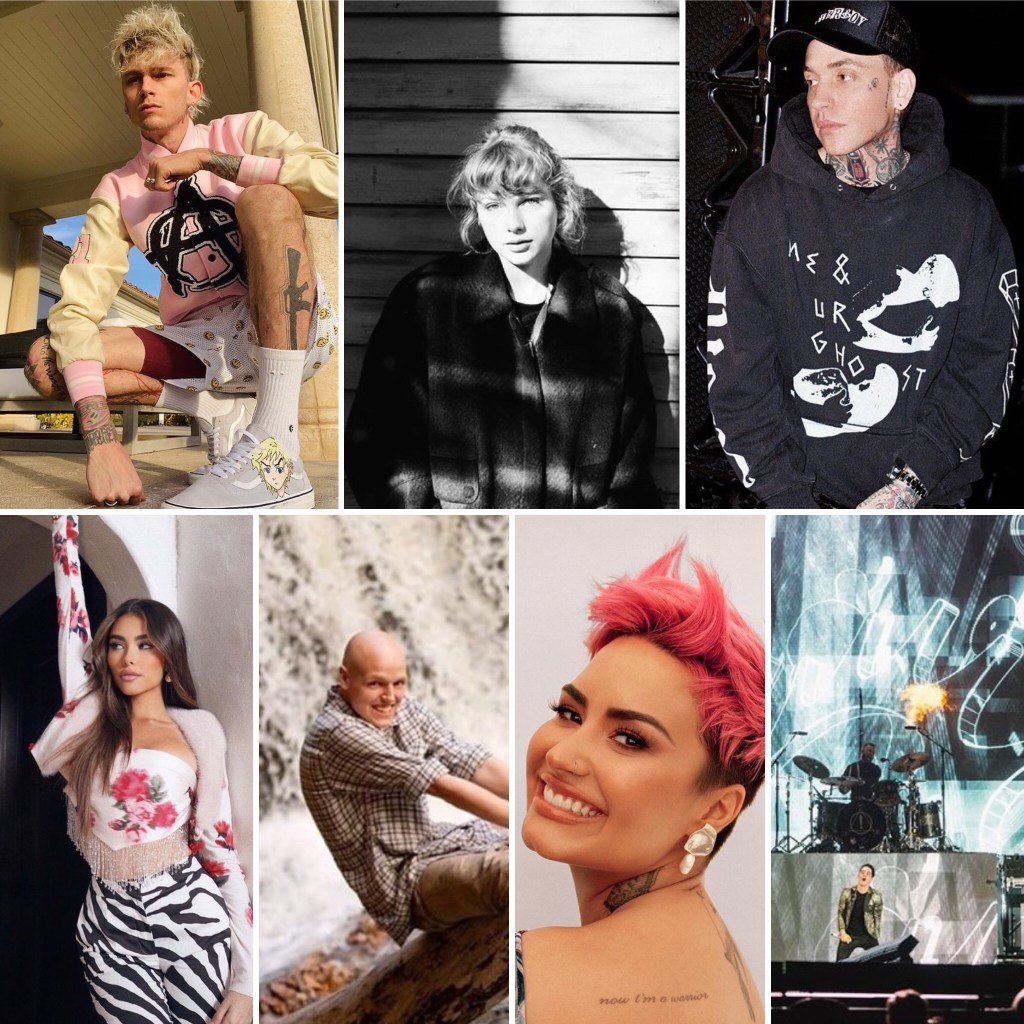 A: a) Machine Gun Kelly – universal, b) Taylor Swift – heartbreak c) Madison Beer – a Queen d) Demi Lovato – soulful e) Zach Sobiech – inspirational f) Blackbear – funny g) Panic at the Disco! – talented